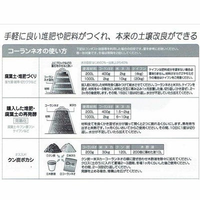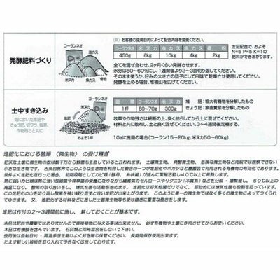 コーランネオは酵母・乳酸菌・麹菌培養物を米ぬかに吸着、各種ミネラル・糖・低分子キチンキトサン・数種のアミノ酸を組み合わせた醗酵腐熟促進剤です。