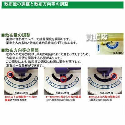 かるがる散布、定番の軽量タイプ 1キロ粒剤も3キロ粒剤もおまかせ! 主な特長 ●農薬、種子(麦)、肥料と多用途。 ●1kg剤・3kg剤と粒剤の少量均一散布ができます。 ●散布幅は約6mで10アール当たり8分と能率的です。 メリット ●ハンドルを回すだけで楽に全面均一散布作業ができます。 ●手動式のため自分のペースで散布できます。
