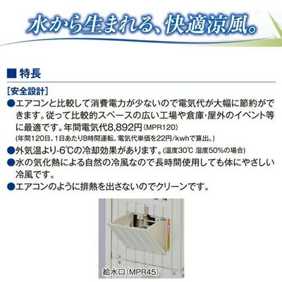 ・エアコンと比較して消費電力が少ないので電気代が大幅に節約ができます。従って比較的スペースの広い工場や倉庫・屋外のイベント等に最適です。