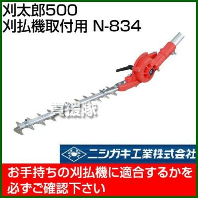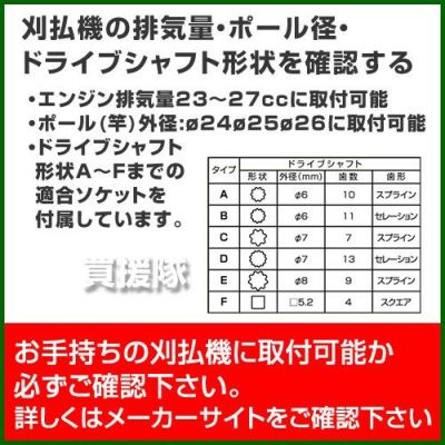 刈払機が高枝バリカンに変わります ギヤケース差換式 上下刃往復式 刈刃角度上下可変式 最大切断径(約7mm) ■お手持ちの刈払機に取りつけ可能か必ずご確認下さい。 刈払機の排気量・ポール径・ドライブシャフト形状を確認する 取付条件 ・エンジン排気量:23~27cc ・ポール(竿)外径:Φ24Φ25Φ26 ・ドライブシャフト形状A~Fまでの適合ソケットを付属しています。 詳しくはメーカーサイト(ニシガキ)を必ずご確認下さい ■軽量になりました。 ■角度が簡単に変わります。 ■作業が安全に出来ます。