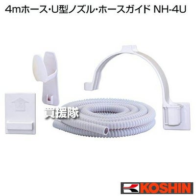 洗濯機まで余裕で届く4mホース 用途にあわせて便利な機能付き すぐに使える 4mホース 水の出口方向を変えられるU型ホースガイド ポンプとホースを収納できるホースホルダー ホースを個定する吸盤 電源器を収納できる 電源器ホルダー