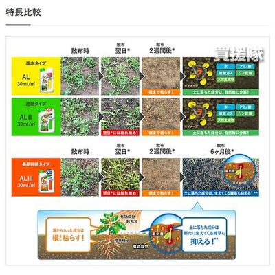 散布後雑草が翌日には枯れ始め、長く抑草、出て来る雑草もブロックします。