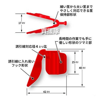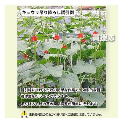 キュウリ等の吊り降ろし栽培の省力化に!! ●特長 ダブルフック式で誘引線に茎をカンタンに掛けることができます。 茎が太くなっても柔軟な構造のため茎が製品にくい込みにくくなっています。 誘引時横方向の移動が楽に行えるので茎と茎との間隔調整が楽に行えます。 組み立てのないシンプルな形状と、UVカット剤入りの素材を使用しているので壊れにくく繰り返し使用できます。 誘引線が揺れても外れにくい構造です。