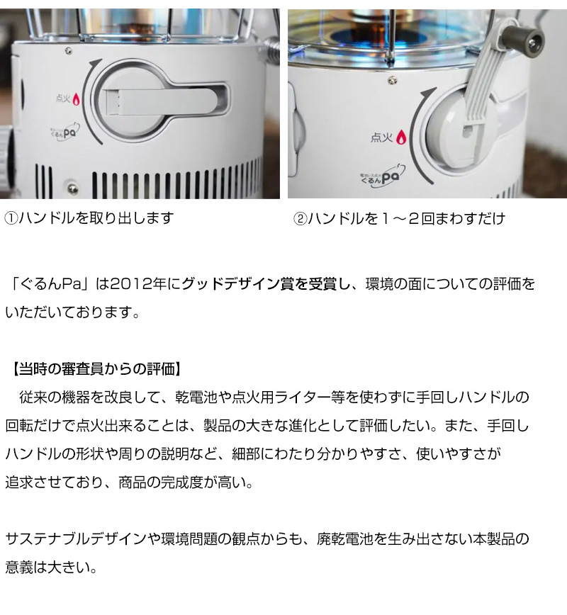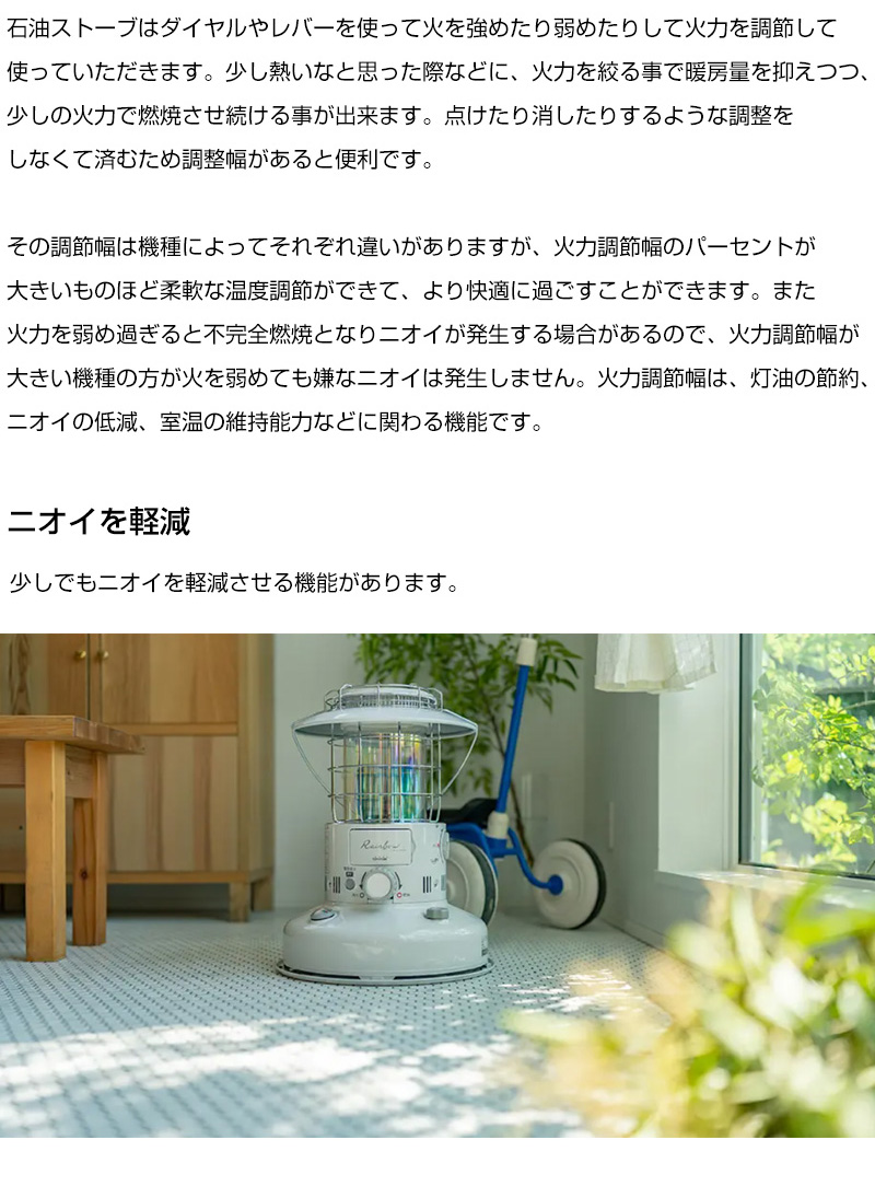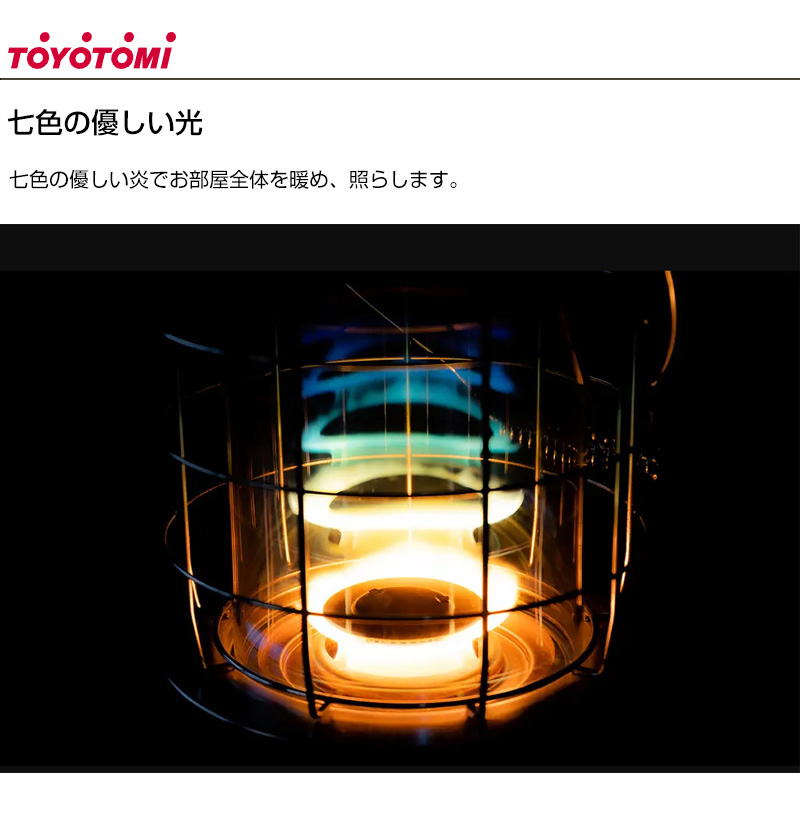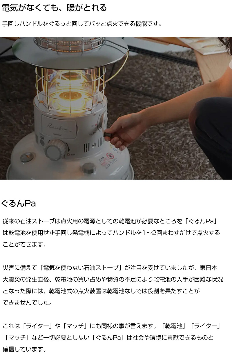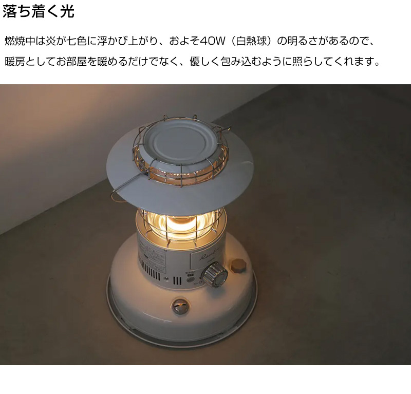 オンラインストア限定モデル 電池レス石油ストーブ 電気がなくても暖がとれる!手回し点火石油ストーブ ●七色の優しい光 七色の優しい炎でお部屋全体を暖め、照らします。 ●電気がなくても、暖がとれる 手回しハンドルをぐるっと回してパッと点火できる機能です。