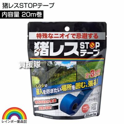 イノシシが警戒する特殊忌避香料で侵入を防ぎます。 イノシシが本能的に危険を感じるニオイと猛獣のニオイとをダブルで配合しています。 設置が簡単なテープタイプです。 防護柵や電気柵と併用すると効果が高まります。 効果は2~3ヶ月間持続します(天候や設置条件により異なります)。