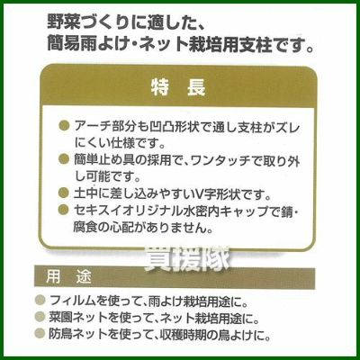 アーチ形状の1本曲げ支柱で、さまざまな菜園用支柱に使用可能。 フィルムを使って、『雨よけ栽培に』。 菜園ネットを使って、『つる性植物のネット栽培に』。 防鳥ネットを使って、収穫前の『鳥よけ用囲いの骨組みとして』。 ■ポイント 1.結束・誘引固定時のズレ防止 支柱全体のイボ凹凸により、支柱同士・支柱-植物の固定時、ズレにくい。 2.端部の水密キャップで高耐久性 支柱の両端部は、セキスイ独自の水密・V字カット加工。差し込み易く、内側からの錆びの心配がありません。 3.豊富なサイズバリエーション さまざまな用途展開が可能。使い方、自由自在。