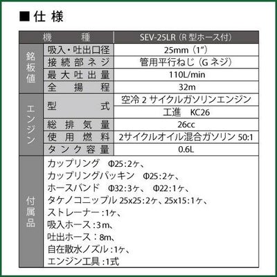 - 付属品 カップリングΦ25、2ヶ/カップリングパッキンΦ25、2ヶ/ホースバンドΦ32、3ヶ/Φ22、1ヶ/タヶノコニップル25x25、2ヶ/25x15、1ヶ/ストレーナー、1ヶ/吸入ホース、3m/吐出ホース、8m/自在散水ノズル、1ヶ/エンジン工具、1式