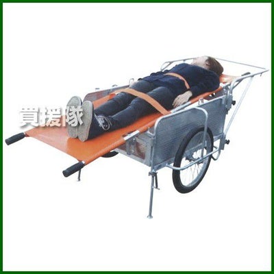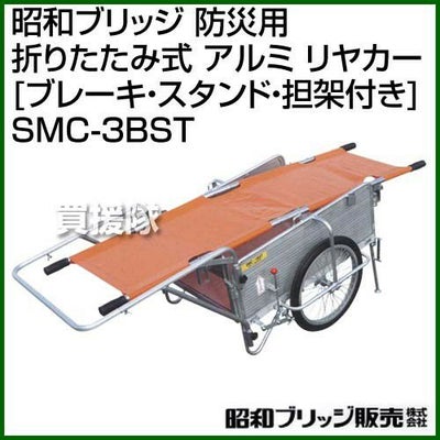 折りたたみ式アルミ製リヤカー 災害用として数多くの実績がある、SMCシリーズをベースに、災害時に要援護者を安全に搬送するため、数々の安全装置を袋備しました。 ●頑丈な担架ストッパー金具 ●ワンタッチ操作の駐車ブレーキ ●ソフトノーパンクタイヤを装備 ●後部の安全スタンド ●コンパクト収納 ●組立は工具不要