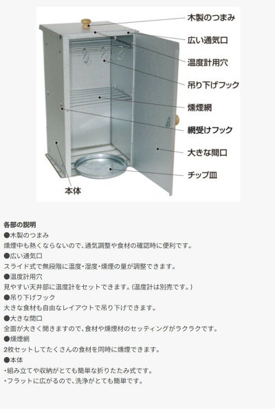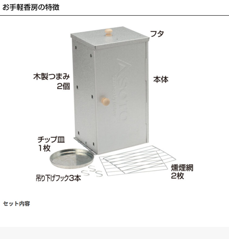 - セット内容本体、フタ、燻煙網(2枚)、チップ皿(1枚)、吊り下げフック(3本)、木製つまみ(2個)