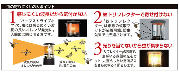 - ※1 気温25℃無風状態で点火から5分後の光源から50cm離れた地点で、ハーフスクリーンカラーホヤのクリアー面使用で蚊トリフレクター装着時での測定値。