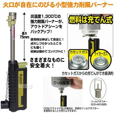火口が自在にのびる小型強力耐風バーナー。