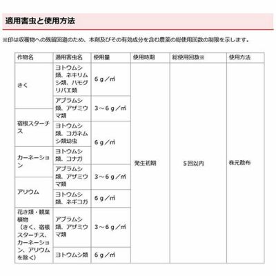 - ※土壌が極度に乾燥している時は使用しないでください(効果)。 芝のスジキリヨトウ、シバツトガ及びタマナヤガの防除に使用する場合、散布後1m2当り0.5~1.0Lの散水を行ってください(効果)。