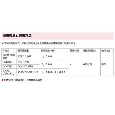 ※皮ふに付着しないように注意してください。皮ふに付いた場合は直ちに石けんでよく洗い落としてください(刺激性)。かぶれやすい人は取扱に十分注意してください。散布時は、農薬用マスク、手袋、長ズボン・長袖作業衣などを着用してください。作業後は手足、顔などを石けんでよく洗い、うがいをしてください。自動車、壁などの塗装面、大理石、御影石に散布液がかからないように注意してください(塗装汚染・変色)。