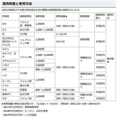 ※石灰硫黄合剤、ボルドー液等アルカリ性薬剤及び微量要素肥料との混用はさけてください。本剤はなしに対して極微量で薬害を生じます。また、同一の散布器具、容器を用いてなしに薬剤散布をしないでください。やむをえず本剤使用後の散布器具をなしに使用する場合は、薬液タンク、散布器具、配管部分、ホース等の内部を十分に洗浄したのち、更にその散布器具を用いて、散布を予定しているなしのすべての品種の新葉の少数に清水を散布し、7日程度おいたのち薬害を生じないことを確認した上で使用してください。
