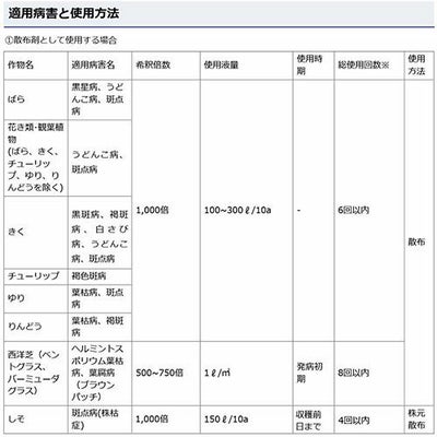 ※使用直前に、容器をよく振ってください。石灰硫黄合剤との混用はさけてください。花き類に使用する場合、花弁に薬液が付着しますと漂白・退色などによる斑点を生じる場合がありますので、着色期以降の散布はさけてください。