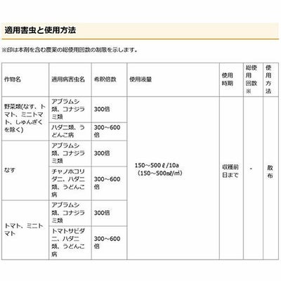 ※なす、ピーマン、はくさい、チンゲンサイ等に使用する場合、幼苗期には葉先枯れを生じることがあるので 使用をさけてください。花き類・観葉植物に使用する場合は、品種、栽培条件等により花弁、苞、葉に薬害を生じる場合があるので、 事前に安全を確認して使用してください。特に結蕾期以降の散布は注意してください。