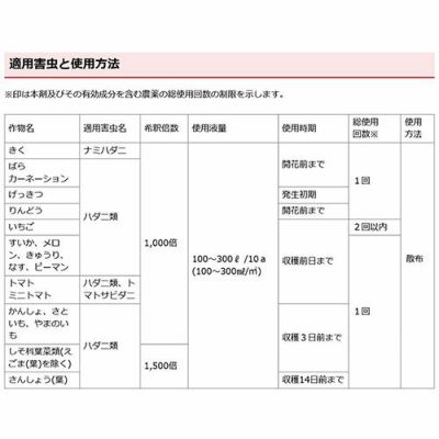 ※使用に際しては容器をよく振ってください。ボルドー液との混用は効果が劣りますので避けてください。散布量は対象作物の生育段階、栽培形態及び散布方法に合わせ、調節してください。本剤は植物体への浸透移行性がないので、かけ残しのないように葉の裏表に十分に散布してください。ハダニ類は繁殖が早く、密度が高くなると防除が困難になりますので、発生初期に散布むらのないようにていねいに散布してください。もものモモサビダニに対して使用する場合、多発生では効果が劣ることがありますので注意してください。
