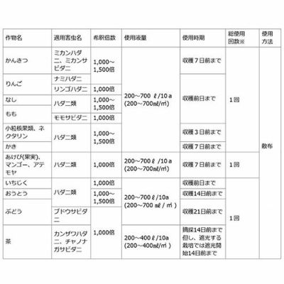 ※本剤の連続散布はハダニ類の本剤に対する抵抗性を発達させるおそれがありますので、できるだけ年1回散布とし、他の殺ダニ剤との輪番で使用してください。本剤の使用に当っては使用量、使用時期、使用方法を誤らないように注意し、特にはじめて使用する場合は、病害虫防除所または販売店等と相談することが望ましいです。適用作物群に属する作物又はその新品種に本剤をはじめて使用する場合は、使用者の責任において事前に薬害の有無を十分確認してから使用してください。