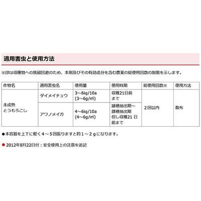 ※体調のすぐれない時は散布しないでください。誤食などのないよう注意してください。散布時は農薬用マスク、手袋、長ズボン・長袖の作業衣などを使用してください。粉末を吸い込んだり、浴びたりしないでください。