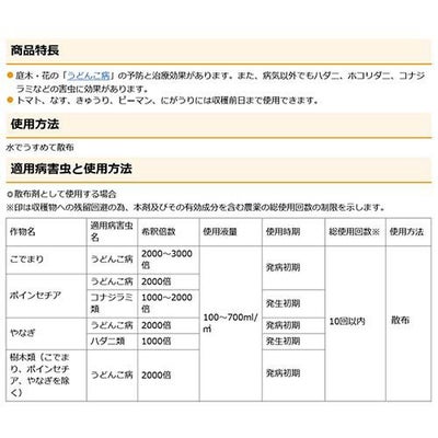 適用作物群に属する作物又はその新品種に本剤を初めて使用する場合は、使用者の責任において事前に薬 害の有無を十分確認してから使用してください。なお、病害虫防除所または販売店等と相談することが望ましいです。メガネとマスク着用ください。粉末は眼に対して強い刺激性がありますので、散布液調製時には保護メガネを着用して薬剤が眼に入らないように注意してください。眼に入った場合には直ちに十分に水洗し、眼科医の手当を受けてください。