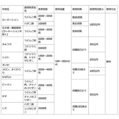 ※ボルドー液等アルカリ性薬剤との混用はさけてください。 盛夏の高温時及び、施設内の高温時での使用は、薬害を生じるおそれがありますので、所定範囲内での低濃度で使用してください。又、定植直後や幼苗、軟弱苗等には使用しないでください。かんきつの盛夏高温時、いちごの収穫間近(果実が白味をおびる頃)での散布は、薬害を生じるおそれがありますので使用はさけてください。 オクラの着果期以降での散布は、果実に薬害を生じるおそれがありますので使用はさけてください。