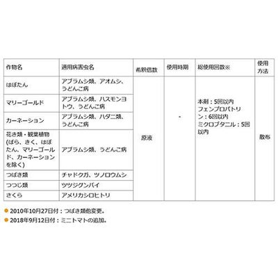 ※適用作物群に属する作物又はその新品種に本剤を初めて使用する場合は、使用者の責任において事前に薬害の 有無を十分確認してから使用してください。なお病害虫防除所または販売店等と相談することが望ましいです。