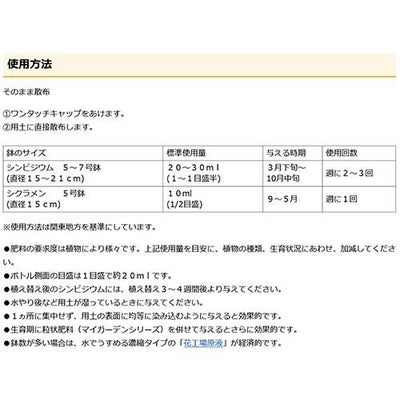 ※肥料の要求度は植物により様々です。使用量を目安に、植物の種類、生育状況にあわせ、加減してください。ボトル側面の目盛は1目盛で約20mlです。植え替え後のシンビジウムには、植え替え3~4週間後より与えてください。