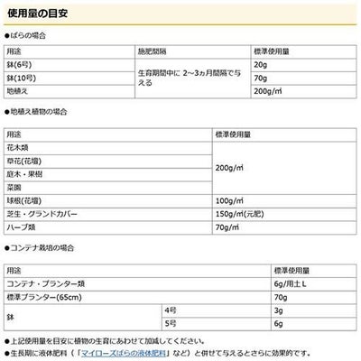 ※元肥として使用する場合は、植物を植える前にあらかじめ土に施します。植え付け、植え替え、種まき時に適量を土に混ぜ込みます。肥料が直接根に触れても肥料焼けしません。