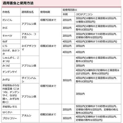 ※適用作物群に属する作物又はその新品種に本剤をはじめて使用する場合は、使用者の責任において事前に薬害の有無を十分確認してから使用する。なお、病害虫防除所または販売店等と相談することが望ましい。