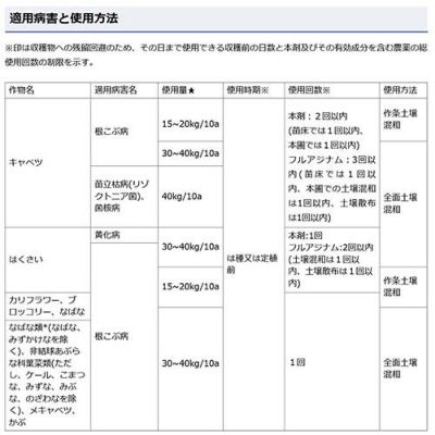 ※用量に合わせ秤量し、使いきってください。砕土をよく行った後、所定量の薬剤を均一に散布し、土壌と十分混和してください。なお、降雨直後の処理はしないでください。根こぶ病を対象に多量に使用すると初期生育が抑制される場合があるので、適用薬量の範囲で使用してください。