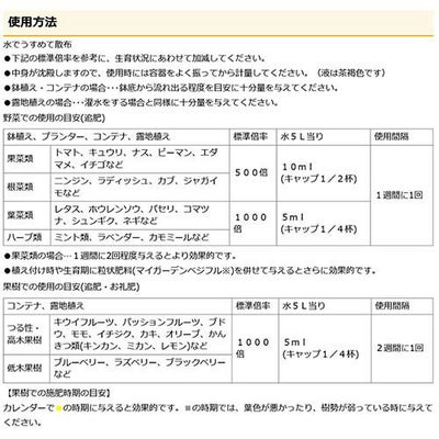 ※標準倍率を参考に、生育状況にあわせて加減してください。中身が沈殿しますので、使用時には容器をよく振ってから計量してください。液は茶褐色です。鉢植え・コンテナの場合、鉢底から流れ出る程度を目安に十分量を与えてください。露地植えの場合、灌水をする場合と同様に十分量を与えてください。