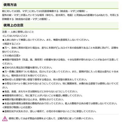 ※体に向かって噴霧しないでください。また、噴霧を直接吸入しないでください。万一、身体に異常が起きた場合は、直ちに本剤がピレスロイド系の殺虫剤であることを医師に告げて、診療を受けてください。