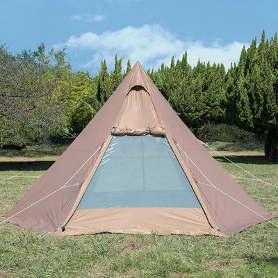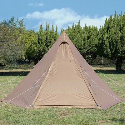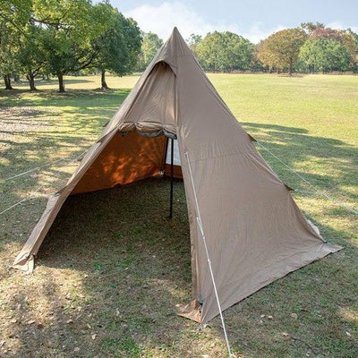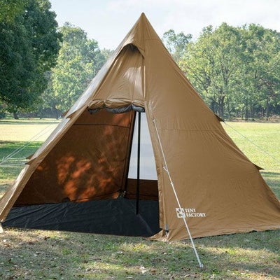 撥水性のあるTC素材を採用(耐水圧2000mm)したワンポールテント。 前後の入り口はメッシュドアもある2重仕様。 専用グランドシート付き。