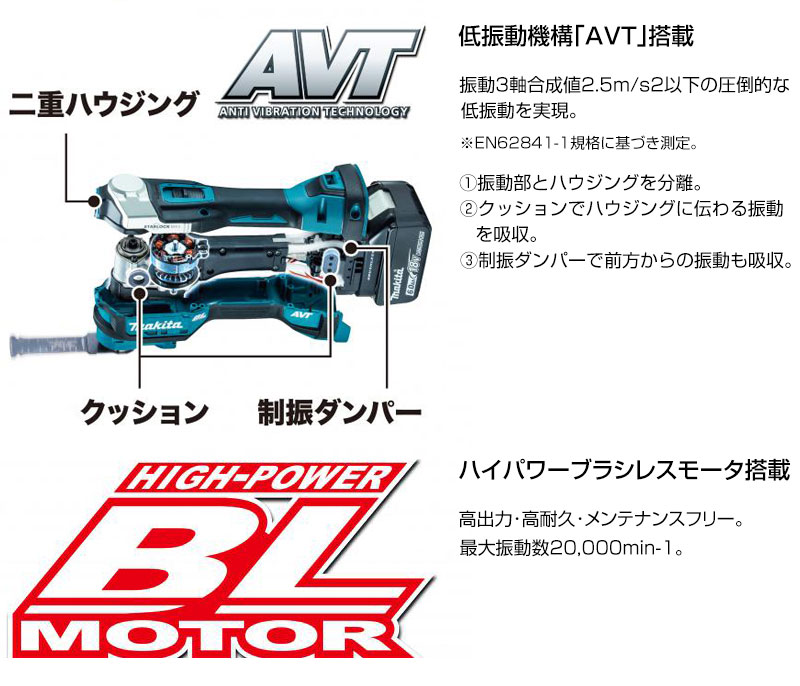 【ハイパワーブラシレスモータ搭載】高出力・高耐久・メンテナンスフリー。最大振動数20,000min-1。
