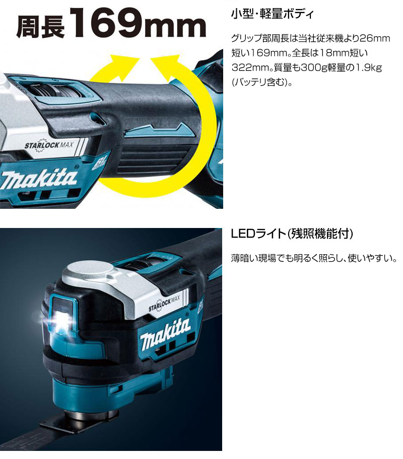 - 付属品バッテリBL1860B、充電器DC18RF、ケース、カットソーMAM001(A-71320)、サンディングパッド(A-64098)、サンディングペーパー(木工用#60/#120/#240各2枚)、ツールボックス