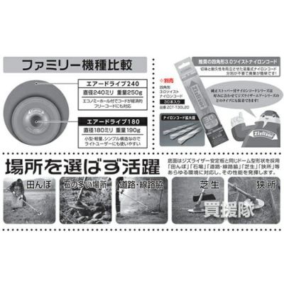 円盤型ナイロンカッターが更にいっそう小型になりました!直径はわずか180mm、重量はたったの190gです!他のジズライザーシリーズ同様に地ズリしながら草刈り作業ができます。専用の四角形3.0ツイストナイロンコードで切味抜群!
