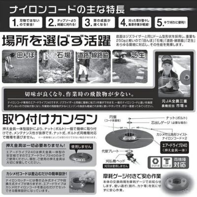 ナイロンカッターには巻き込み式タイプや段換え式タイプがありますが、エアードライブ240はカシメ付ナイロンコードを差し込むだけでセットできる簡単設計になっています。