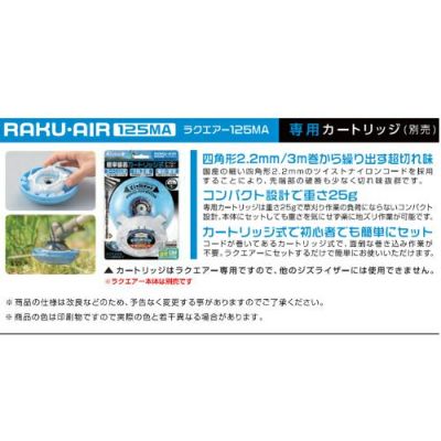 純正ツイストナイロンコード専用カートリッジ カートリッジ式で簡単にセット!巻かずにポンッと入れるだけ。 ・四角形2.2mm/3m巻きから繰り出す超切れ味。 ・コンパクト設計で重さ25g ・カートリッジ式で初心者でも簡単にセット出来ます。 ※ラクエアー(別売)専用カートリッジです。