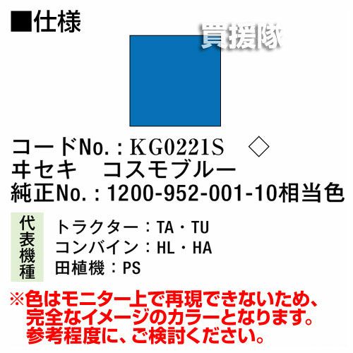 他の画像を見る 農機などの補修用に KBL 農業機械用塗料用 タッチアップスプレー KG0221S [ヰセキ:コスモブルー][内容量420ml] 買援隊 特別価格 ¥ 1,540 税込 詳細を見る お気に入りに登録する