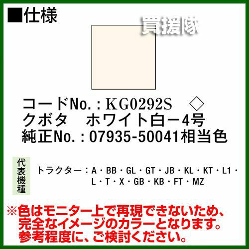 他の画像を見る 農機などの補修用に KBL 農業機械用塗料用 タッチアップスプレー KG0292S [クボタ:ホワイト白-4号][内容量420ml] 買援隊 特別価格 ¥ 1,540 税込 詳細を見る お気に入りに登録する