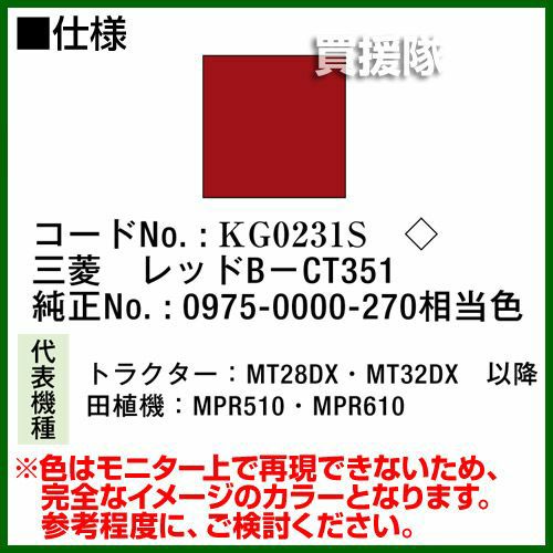 他の画像を見る 農機などの補修用に KBL 農業機械用塗料用 タッチアップスプレー KG0231S [三菱:レッドB-CT351][内容量420ml] 買援隊 特別価格 ¥ 1,540 税込 詳細を見る お気に入りに登録する