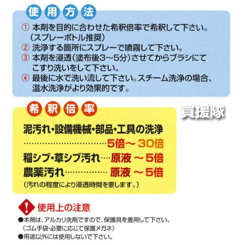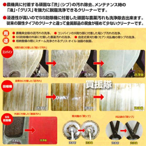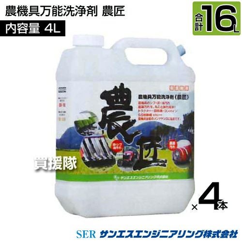 他の画像を見る 【送料無料】農機具の汚れ、丸ごと強力洗浄!超濃縮液 《法人限定》サンエスエンジニアリング 農機具万能洗浄剤 農匠 4L×4本 買援隊 特別価格 ¥ 16,800 税込 詳細を見る お気に入りに登録する