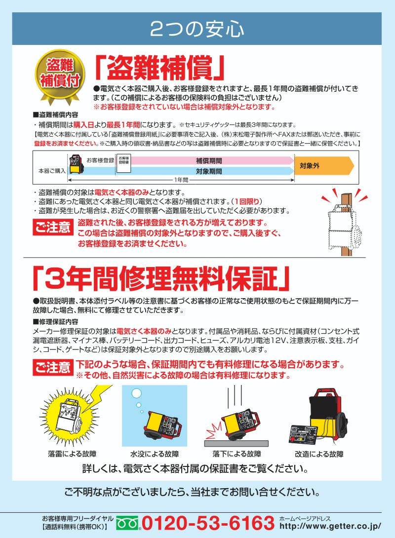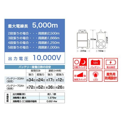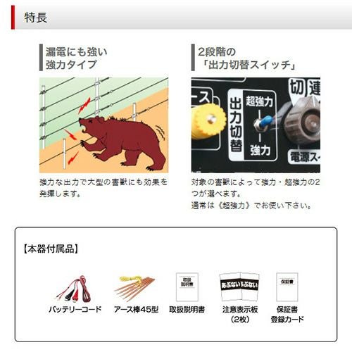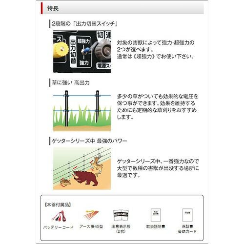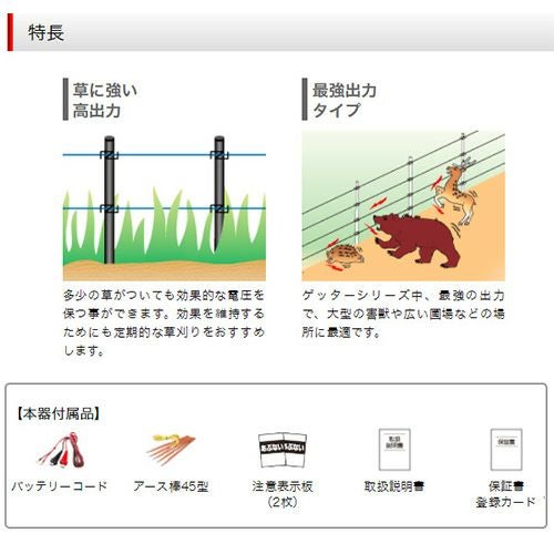 他の画像を見る 【送料無料】漏電にも強い強力タイプ 末松電子製作所 電気牧柵機 ゲッターエースSP 【強力型】 No.103 ACE-SP5 買援隊 特別価格 ¥ 46,700 税込 カートに入れる お気に入りに登録する