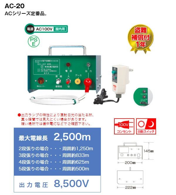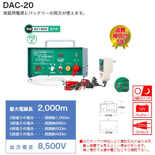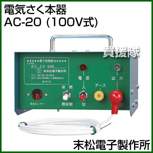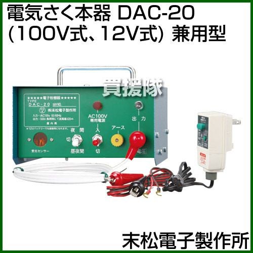 他の画像を見る 【送料無料】家庭用電源とバッテリーの両方が使えます。 末松電子製作所 電気さく本器 DAC-20 (100V式、12V式) 兼用型 108 買援隊 特別価格 ¥ 42,500 税込 カートに入れる お気に入りに登録する