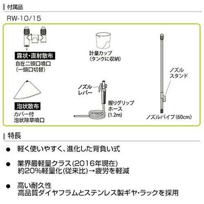 付属品 縦型二頭口噴口 1ヶ、カバー付泡状除草噴口 1ヶ、ノズルパイプ(60cm) 1ヶ、計量カップ 1ヶ、握リグリップ 1ヶ、吐出ホース(1.2m) 1ヶ、ボールコック 1ヶ