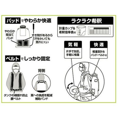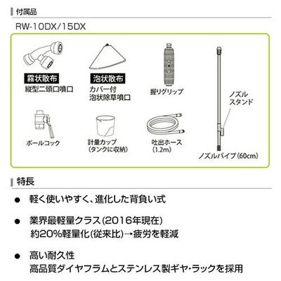 付属品縦型二頭口噴口 1ヶ、カバー付泡状除草噴口 1ヶ、ノズルパイプ(60cm) 1ヶ、計量カップ 1ヶ、握リグリップ 1ヶ、吐出ホース(1.2m) 1ヶ、ボールコック 1ヶ