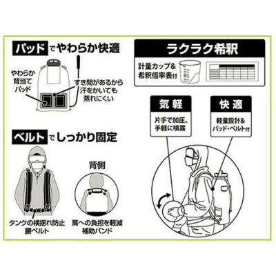 付属品 縦型二頭口噴口 1ヶ、カバー付泡状除草噴口 1ヶ、ノズルパイプ(60cm) 1ヶ、計量カップ 1ヶ、握リグリップ 1ヶ、吐出ホース(1.2m) 1ヶ、ボールコック 1ヶ