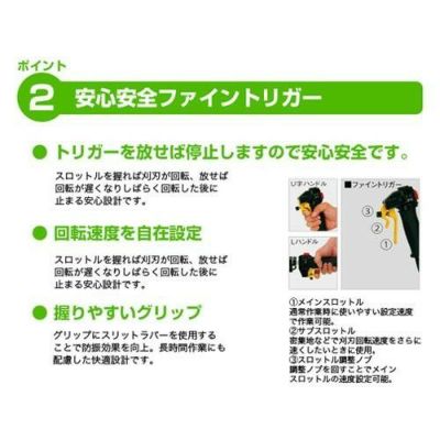 スロットルとクラッチを一体化した独自の親子レバーを採用することにより、操作がしやすく、太い茎や草の密集地に威力発揮。