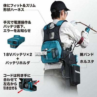 【作業のしやすいバッテリ収納バッグ】ズレにくく、狭い場所でも邪魔にならないスリム形状ハーネス。操作部は腰、胸部に取付可能。電源操作、バッテリ低下&エラーをランプでお知らせ。