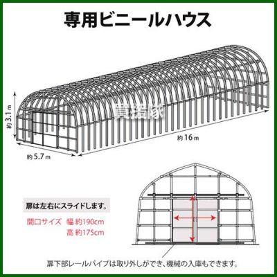 • サイズシステム/約 幅1340×長さ14180×高さ700(mm)×2台、ビニールハウス/約 幅5700×長さ16000×高さ3100(mm)×1棟